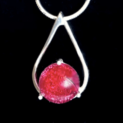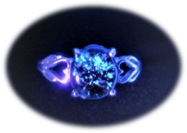 Ashes are specially coated to absorb and release light, and are visible in darkness. They are permanently fused within art glass stones. Choose from over 20 beautiful gem colors and optional sterling or solid gold jewelry settings.